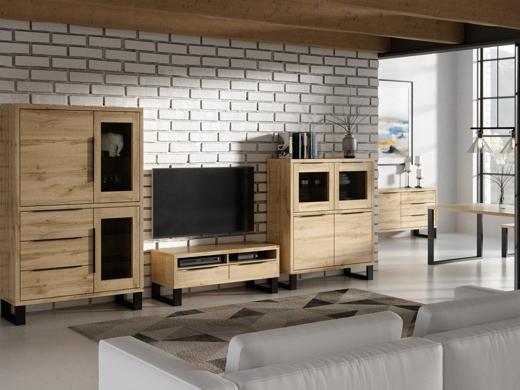La collezione di mobili per soggiorno si sposerà bene con il cemento decorativo o la pietra naturale. Le vetrine, i mobili TV e le cassettiere di questa collezione dispongono di gambe in nero che si abbiano perfettamente con le maniglie in metallo. L'arredamento non è soltanto robusto, ma dispone anche di molti ripiani e cassetti. Con l'elegante vetrina potrai mostrare facilmente la tua porcellana e le tue foto di famiglia, oppure conservare nei cassetti tovaglie, coperte o persino vestiti.