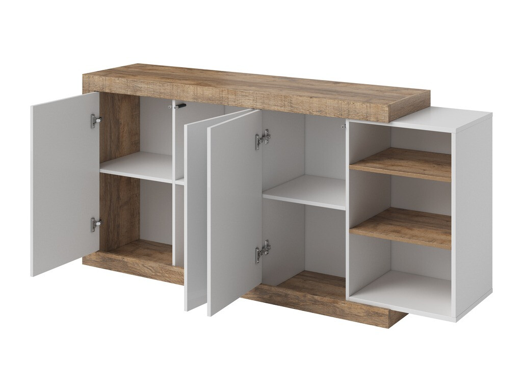 Una collezione di mobili da soggiorno dal design eccezionale che ti conquisterà a prima vista. La collezione è pensata per chi ama il connubio tra eleganza e modernità. Il colore bianco dei mobili crea leggerezza e si abbina perfettamente alla tonalità rovere "Sandal" che aggiunge calore e naturalezza. Questo mobile si distingue per un ripiano integrato a lato. Il design minimalista è esaltato dal fatto che il mobile è privo di maniglie ed è dotato di meccanismo "Push to open". Perché grazie a questo meccanismo ante e cassetti possono essere aperti e chiusi con un solo tocco. I mobili della collezione sono realizzati utilizzando legno ecologico, proveniente da foreste, che offre vantaggi economici.