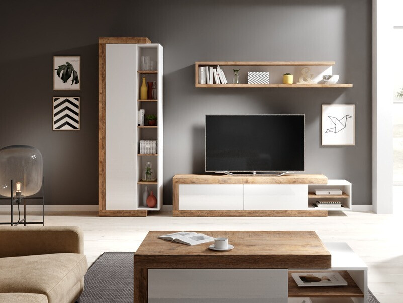 Una collezione di mobili da soggiorno dal design eccezionale che ti conquisterà a prima vista. La collezione è pensata per chi ama il connubio tra eleganza e modernità. Il colore bianco dei mobili crea leggerezza e si abbina perfettamente alla tonalità rovere "Sandal" che aggiunge calore e naturalezza. Questo mobile si distingue per un ripiano integrato a lato. Il design minimalista è esaltato dal fatto che il mobile è privo di maniglie ed è dotato di meccanismo "Push to open". Perché grazie a questo meccanismo ante e cassetti possono essere aperti e chiusi con un solo tocco. I mobili della collezione sono realizzati utilizzando legno ecologico, proveniente da foreste, che offre vantaggi economici.