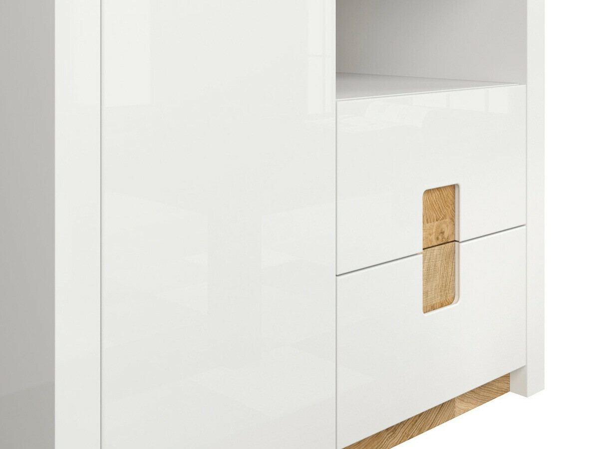 Questa collezione di mobili è unica in quanto offre una vasta selezione di modelli di mobili per vari spazi domestici. Crea un interno solido sia nel soggiorno che nella camera da letto. E se i mobili si inseriscono anche nel corridoio? O in ufficio? Tutto ciò è possibile con questa collezione. La tavolozza dei colori chiari avrà un bell'aspetto in spazi sia piccoli che grandi. Le facciate dei mobili sono dominate da un colore bianco lucido, che è perfettamente integrato da dettagli color legno. Il colore e i motivi del legno sono meravigliosamente rivelati nei tavoli dei mobili, dando una sensazione di intimità. La soluzione della maniglia attira l'attenzione, adattandosi anche a dettagli di arredamento. Ci sarà sicuramente abbastanza spazio per conservare i tuoi oggetti, i mobili hanno molti cassetti e scaffali. Il fascino aggiuntivo è fornito dall'illuminazione a LED a risparmio energetico integrato. Questa soluzione ti permetterà di goderti una luce accogliente che metterà in evidenza gli inserti color legno. Il meccanismo di chiusura silenzioso proteggerà rapidamente le porte e i cassetti dalla chiusura.