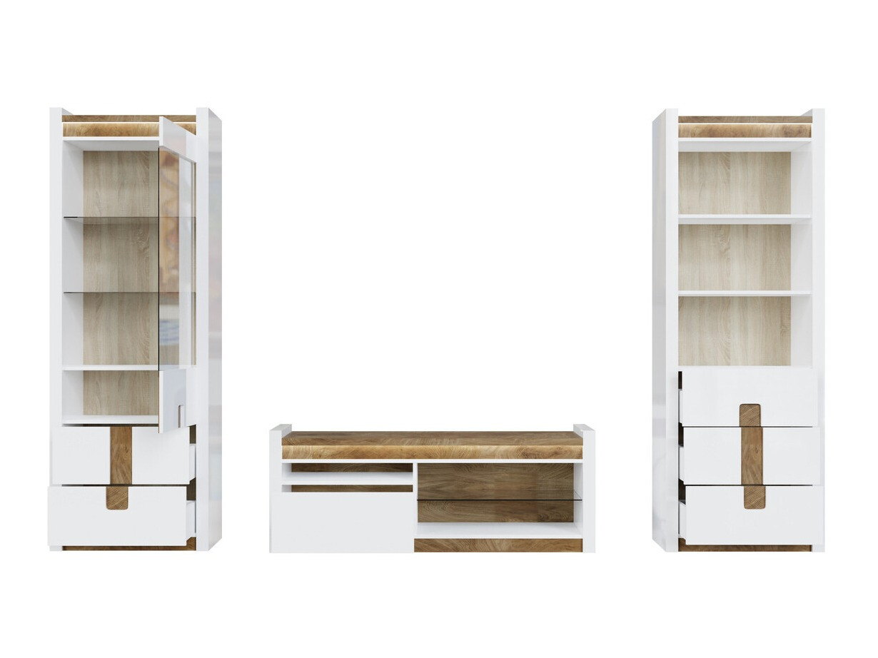Questa collezione di mobili è unica in quanto offre una vasta selezione di modelli di mobili per vari spazi domestici. Crea un interno solido sia nel soggiorno che nella camera da letto. E se i mobili si inseriscono anche nel corridoio? O in ufficio? Tutto ciò è possibile con questa collezione. La tavolozza dei colori chiari avrà un bell'aspetto in spazi sia piccoli che grandi. Le facciate dei mobili sono dominate da un colore bianco lucido, che è perfettamente integrato da dettagli color legno. Il colore e i motivi del legno sono meravigliosamente rivelati nei tavoli dei mobili, dando una sensazione di intimità. La soluzione della maniglia attira l'attenzione, adattandosi anche a dettagli di arredamento. Ci sarà sicuramente abbastanza spazio per conservare i tuoi oggetti, i mobili hanno molti cassetti e scaffali. Il fascino aggiuntivo è fornito dall'illuminazione a LED a risparmio energetico integrato. Questa soluzione ti permetterà di goderti una luce accogliente che metterà in evidenza gli inserti color legno. Il meccanismo di chiusura silenzioso proteggerà rapidamente le porte e i cassetti dalla chiusura.