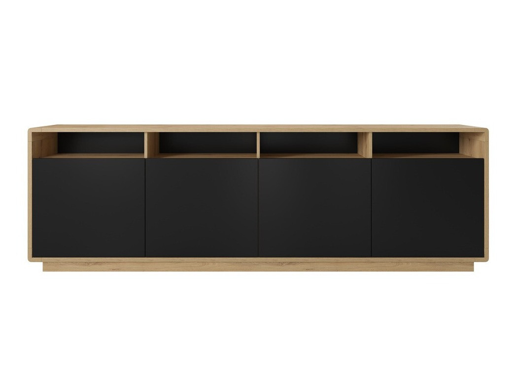 La collezione di mobili troverà sicuramente il suo posto nelle case delle persone che amano l'interior design moderno. I mobili in colore nero sono ravvivati dai fianchi in rovere. La caratteristica principale di questa collezione è la sua finitura altamente opaca. E' rivestito con una speciale pellicola "Supermatt", che protegge la superficie del mobile dalle impronte. Il design esclusivo della collezione è sottolineato dal meccanismo "Push to open", che consente di aprire facilmente l'anta del mobile selezionato con un solo tocco. I mobili hanno angoli arrotondati per una protezione extra per i bambini che giocano nelle vicinanze. L'illuminazione a LED può essere installata negli spazi aperti dei mobili. La collezione comprende tutti i mobili base del soggiorno: una mensola, un tavolino da caffè, una mensola pensile, oltre a armadi e tavolini TV in diverse dimensioni.