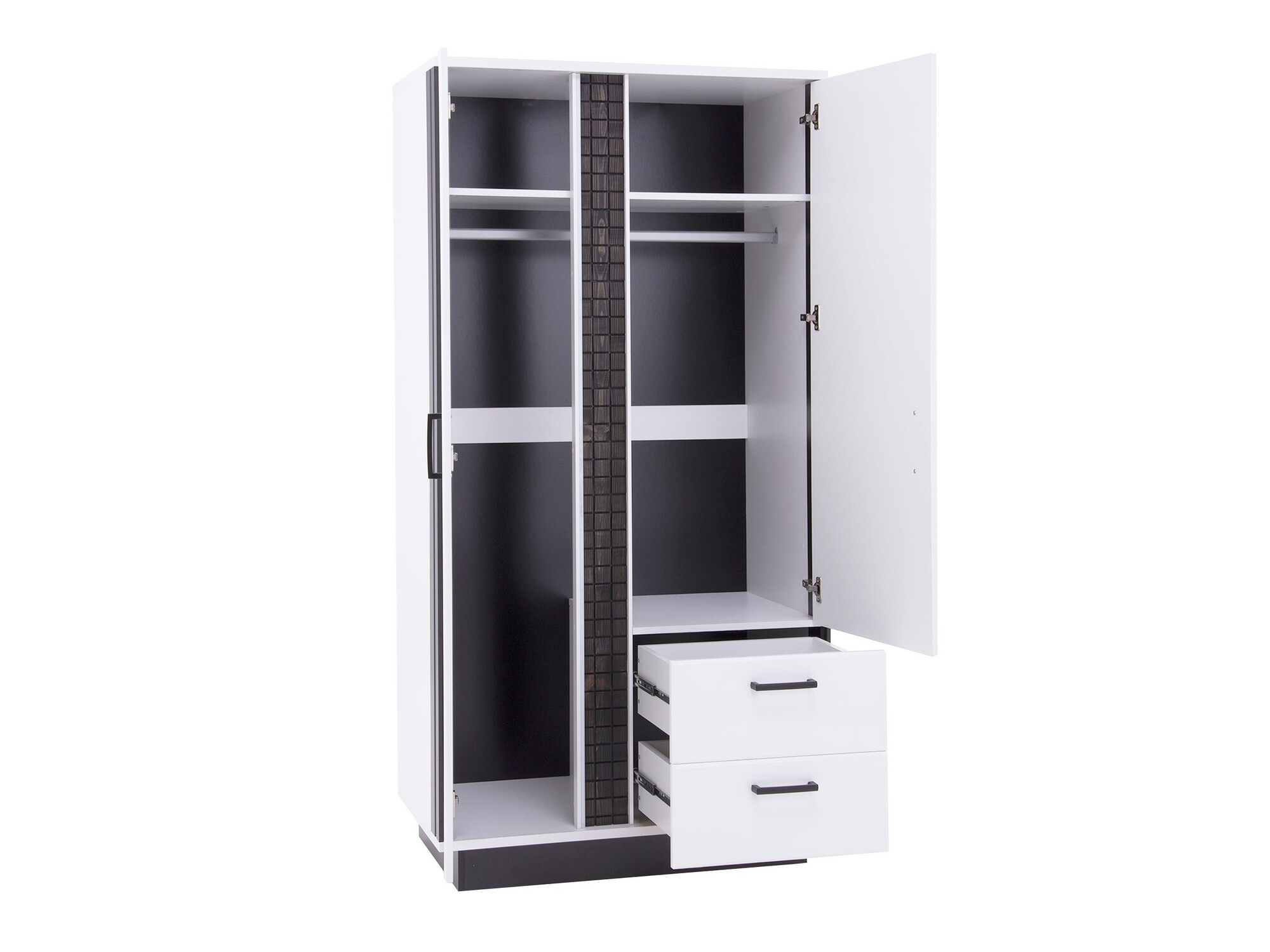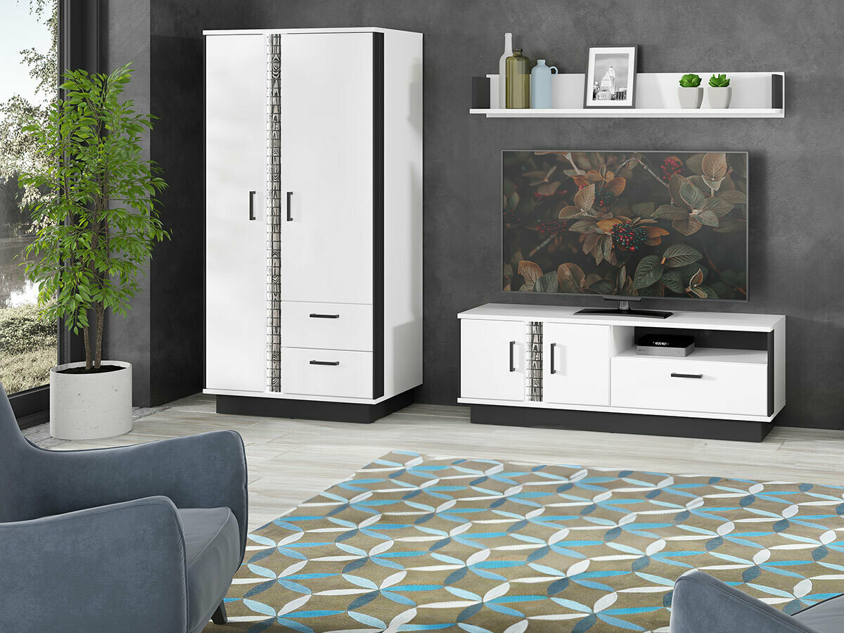 Questa collezione di mobili per il soggiorno è dominata da bianco lucido integrato da dettagli neri. Gli elementi di imitazione in legno danno ai mobili un carattere esclusivo. Le facciate dei mobili sono decorate con maniglie di plastica nera. Il vetro temperato utilizzato nella raccolta è più resistente agli effetti meccanici rispetto al vetro ordinario. L'illuminazione a LED a risparmio energetico opzionale fornirà un'atmosfera unica. I bordi dei mobili sono protetti con un nastro di finitura speciale che li protegge da danni minori. I mobili hanno un meccanismo di chiusura silenzioso che impedisce la chiusura rapida ai cassetti e alle porte. Se stai cercando di creare un interno di casa esclusivo ed elegante, ti invitiamo a prestare attenzione a questa collezione!
