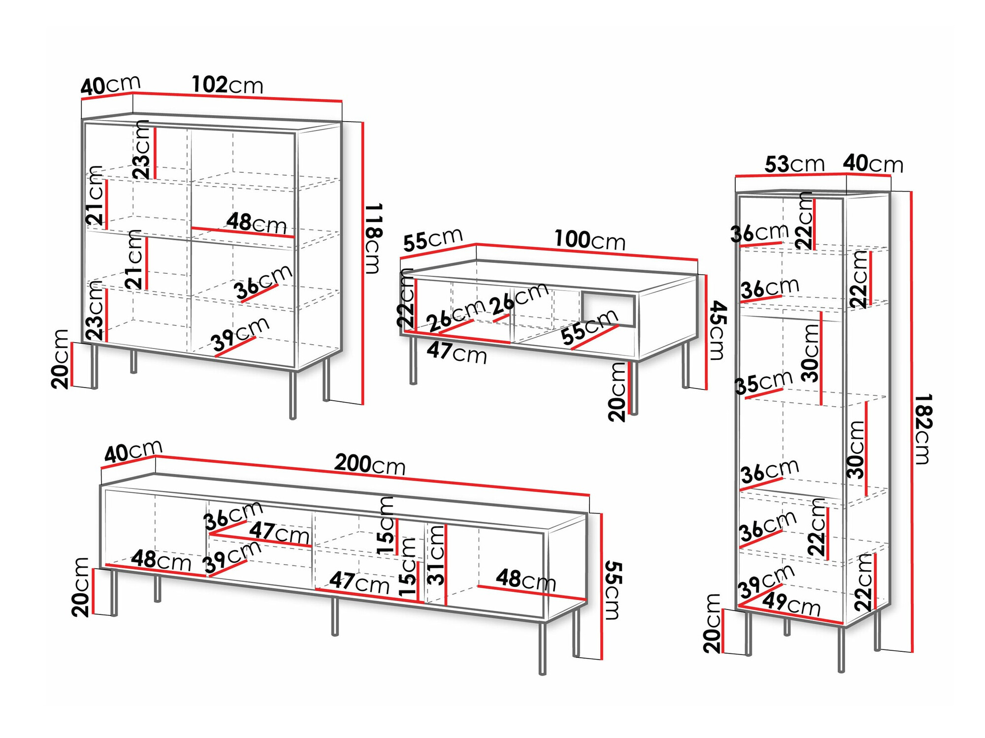 55 x 200 x 40 cm