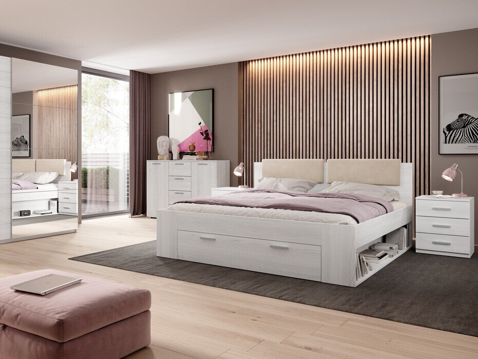 Il letto di questa collezione viene fornito con un contenitore apribile incorporato e un comodo poggiatesta perfetto per un'accogliente serata passata a leggere un libro. Un altro vantaggio di questa collezione di mobili per la camera da letto sono i comodini, che si adatteranno perfettamente ad una lampada da tavolo e diventeranno un luogo comodo dove appoggiare il libro che stai leggendo. L'elegante cassettiera si abbinerà davvero bene con i mobili in legno scuro, non solo nella camera da letto ma anche per il soggiorno.