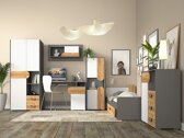 È estremamente importante combinare funzionalità e design nella stanza di un ragazzo. Se stai cercando soluzioni moderne per la stanza di un ragazzo, vale la pena dare un'occhiata a questa collezione. I mobili della collezione sono progettati per le esigenze della mentalità di un ragazzo giovane, quindi la modernità va insieme alla funzionalità qui. È stato scelto un design asimmetrico per le facciate dei mobili, che dà giocosità. Vengono usati tre colori: bianco, grafite e quercia. Il colore in quercia dà conforto e allo stesso tempo si distingue come un accento. La forma unica delle maniglie corrisponde perfettamente al design dei mobili e cattura l'attenzione. Nella collezione troverai i mobili più necessari per lo spazio della stanza di un ragazzo. Le sezioni di mobili spaziose garantiranno che tutte le cose trovino il loro posto e il mantenimento dell'ordine sarà un piacere.