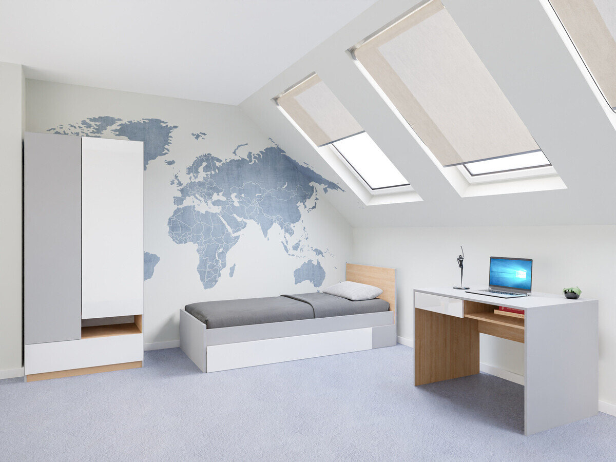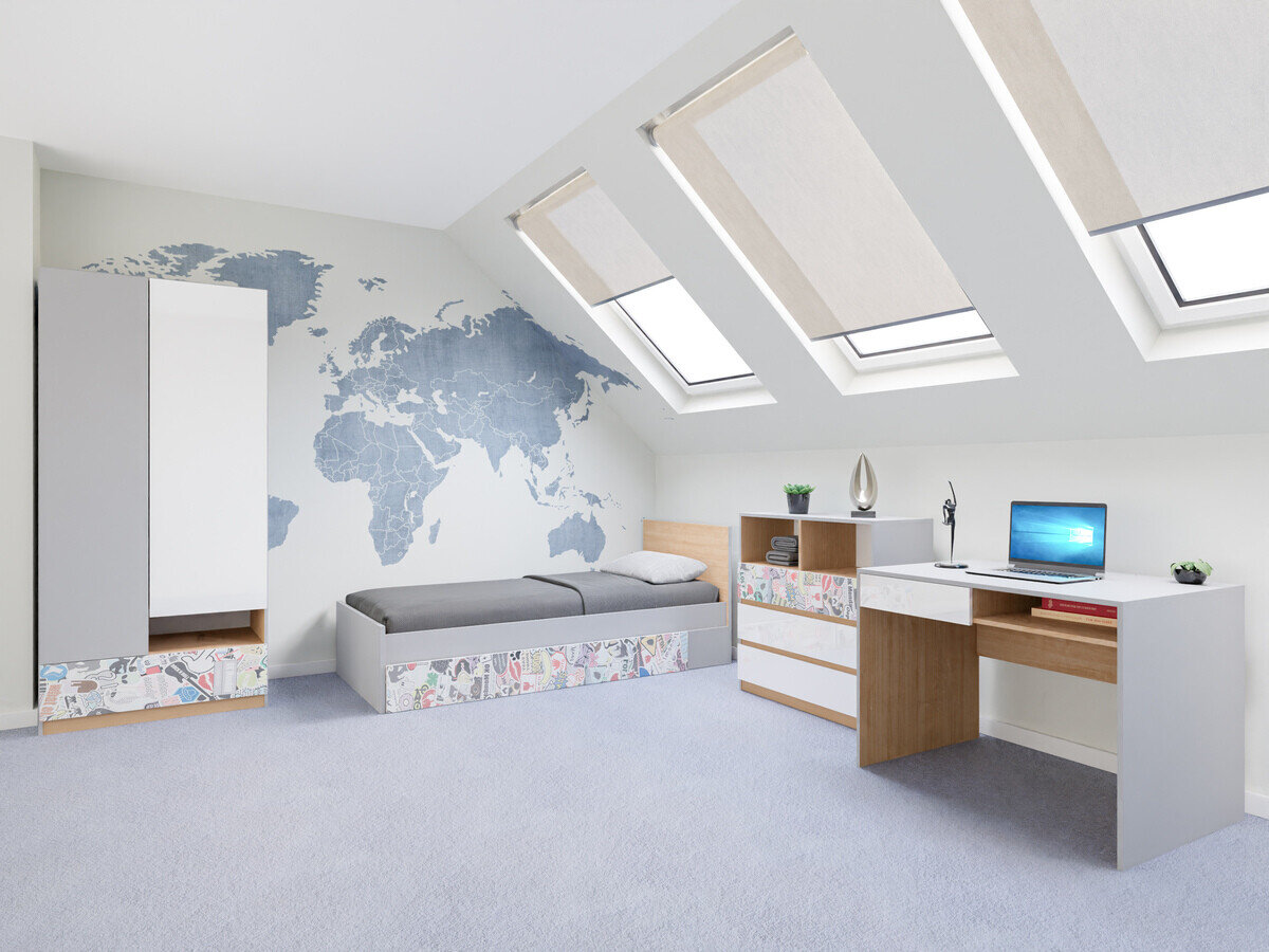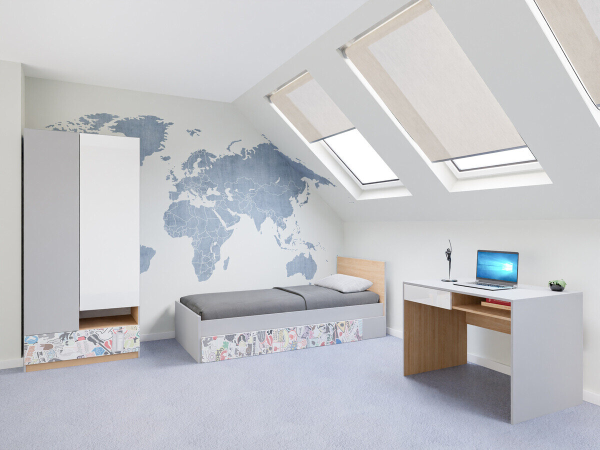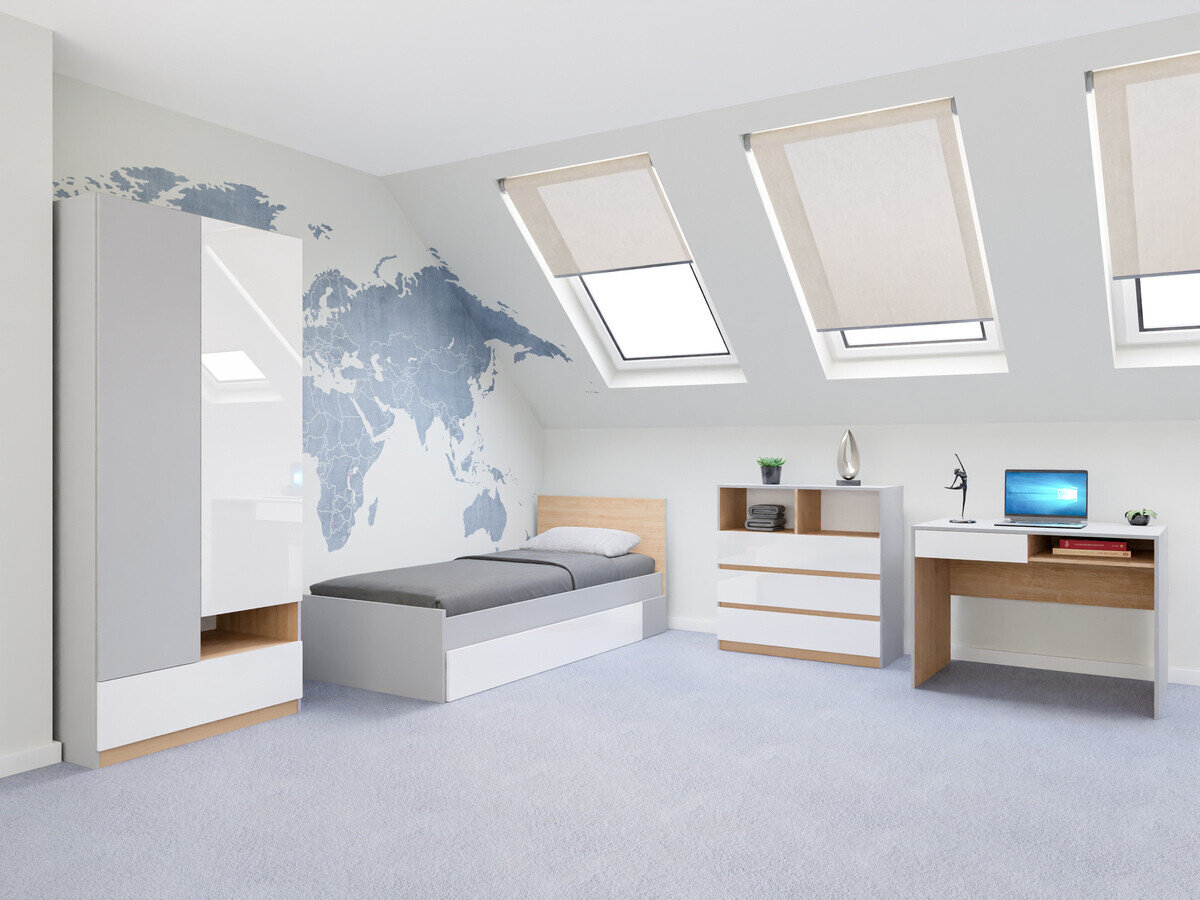 Nella stanza di un bambino o di un ragazzo è importante mantenere un equilibrio tra design e funzionalità. In questo spazio puoi esprimere di più la tua immaginazione, senza aver paura dei colori vivaci o di altri elementi di design. Innovazione e creatività si uniscono nella collezione. I mobili della collezione hanno forme chiare, colori grigio chiaro, rovere e bianco lucido. I mobili combinano colori neutri ed elementi colorati che completano il design e si fondono perfettamente con l'intera vista. Senza dimenticare le persone che non sono grandi amanti degli elementi luminosi: nella collezione troverai anche mobili in colori neutri. La flessibilità sarà fornita da mobili spaziosi con sezioni aperte e chiuse. Le superfici dei mobili sono ricoperte da un materiale incolore che protegge da piccoli graffi. C'è anche un meccanismo di chiusura silenzioso integrato nelle ante e nei cassetti, che fornirà ulteriore comfort durante l'utilizzo dei mobili. La collezione di mobili aiuterà a creare facilmente un interno moderno e funzionale per i giovani.
