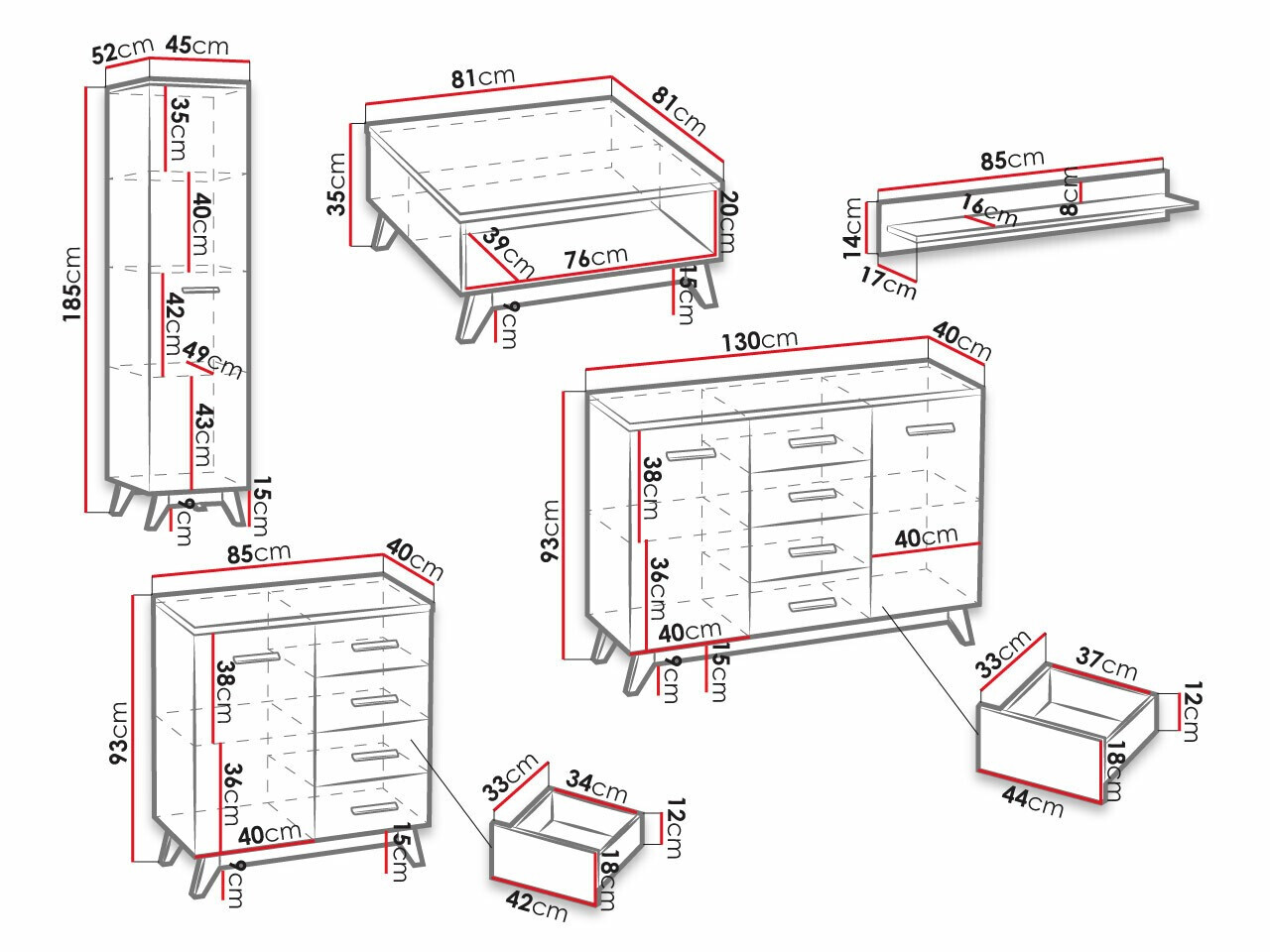 93 x 85 x 40; 93 x 130 x 40 cm