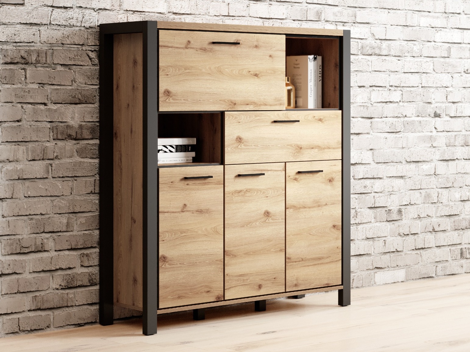 Questa collezione è progettata per gli amanti degli interni industriali. Le maniglie metalliche sono combinate con facciate color quercia chiare che mostrano sentori di legno. La forma delle maniglie si fonde perfettamente in tutto il design. I mobili sono evidenziati da bordi neri opachi che enfatizzano la severa silhouette dei mobili. Una delle caratteristiche principali della collezione è la spaziosità. Sezioni di mobili estremamente spaziose garantiranno che tutti gli oggetti trovino il loro posto. Questa collezione ti permetterà di creare uno stato d'animo interno industriale senza troppi sforzi. Crea un'atmosfera ancora più accogliente a casa ordinando anche l'illuminazione a LED.