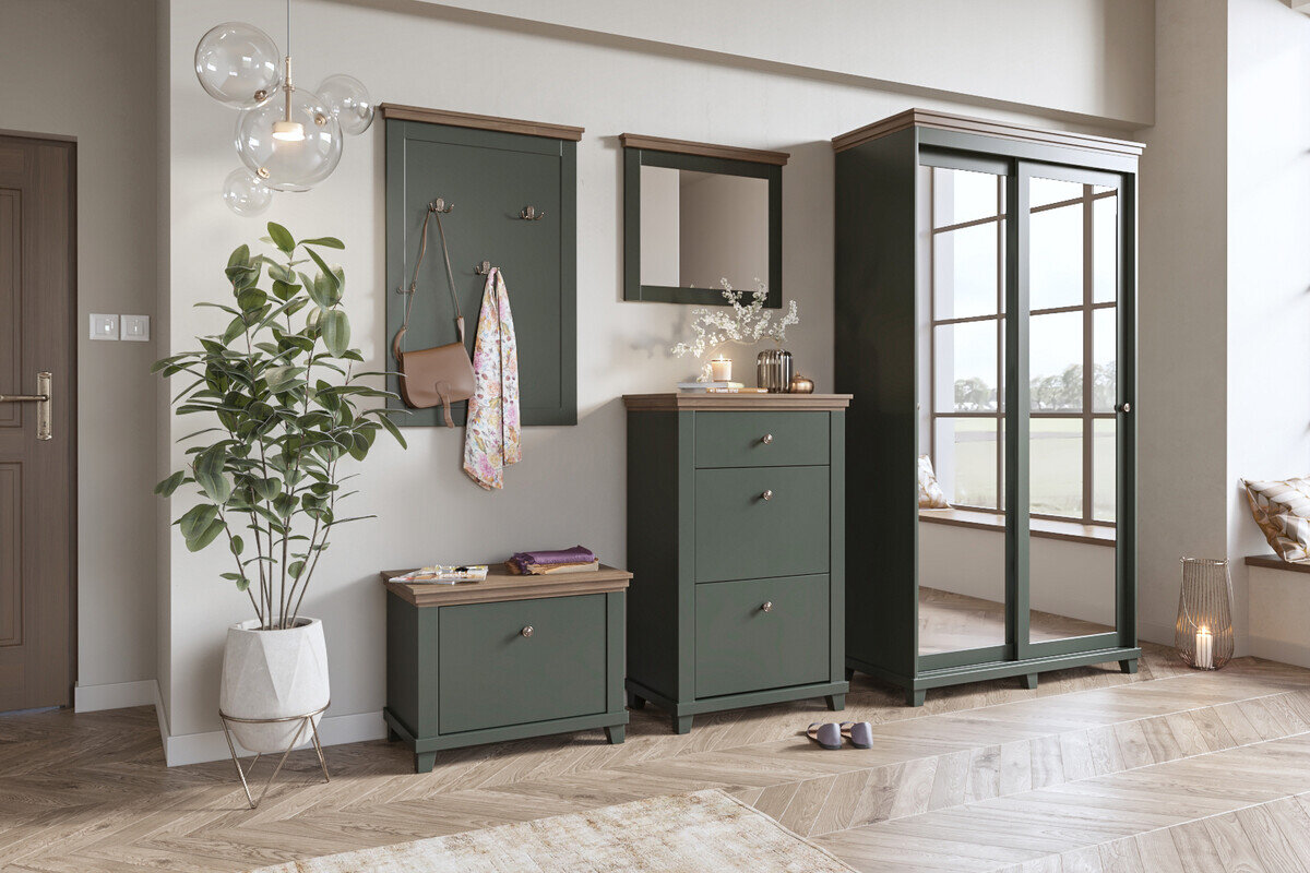 Questa collezione di mobili riflette lo stile dei classici senza tempo completati da moderne combinazioni di colori. Piccole maniglie in metallo e gambe in plastica abbinate al rovere "Lefkas" verde scuro o ai colori frassino sbiancato contribuiranno a mantenere ordinato il design della stanza. La collezione offre mobili pratici adatti per riporre gli oggetti. Le vetrine sono ideali per stoviglie, utensili da pranzo o decorazioni, mentre le cassettiere possono essere utilizzate per riporre ciò che non vuoi vedere tutti i giorni. Un ulteriore accento è donato dall'aggiunta dell'illuminazione a LED, che può essere ordinata separatamente. La collezione è certificata FSC, il che garantisce che i mobili siano realizzati con legno biologico proveniente da foreste economicamente vantaggiose.