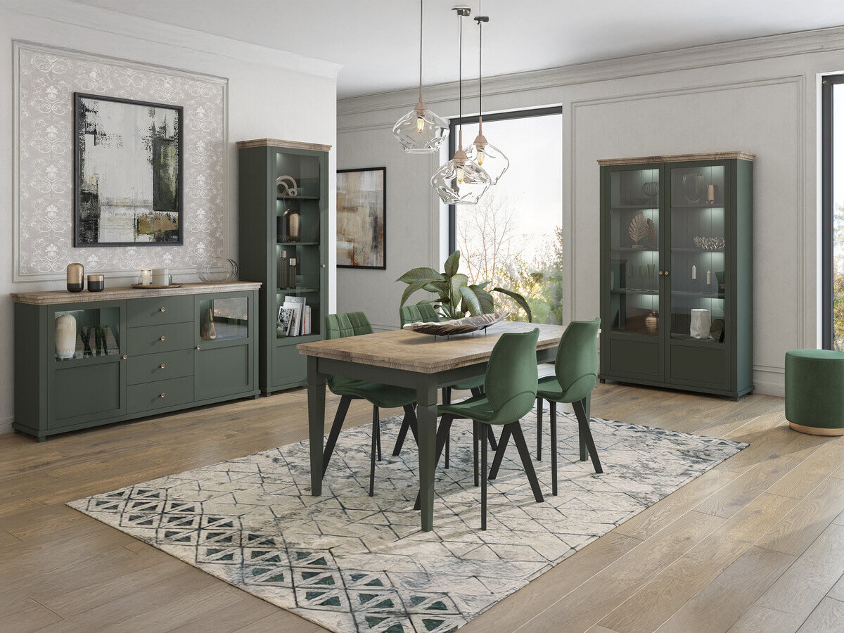 Questa collezione di mobili riflette lo stile dei classici senza tempo completati da moderne combinazioni di colori. Piccole maniglie in metallo e gambe in plastica abbinate al rovere "Lefkas" verde scuro o ai colori frassino sbiancato contribuiranno a mantenere ordinato il design della stanza. La collezione offre mobili pratici adatti per riporre gli oggetti. Le vetrine sono ideali per stoviglie, utensili da pranzo o decorazioni, mentre le cassettiere possono essere utilizzate per riporre ciò che non vuoi vedere tutti i giorni. Un ulteriore accento è donato dall'aggiunta dell'illuminazione a LED, che può essere ordinata separatamente. La collezione è certificata FSC, il che garantisce che i mobili siano realizzati con legno biologico proveniente da foreste economicamente vantaggiose.