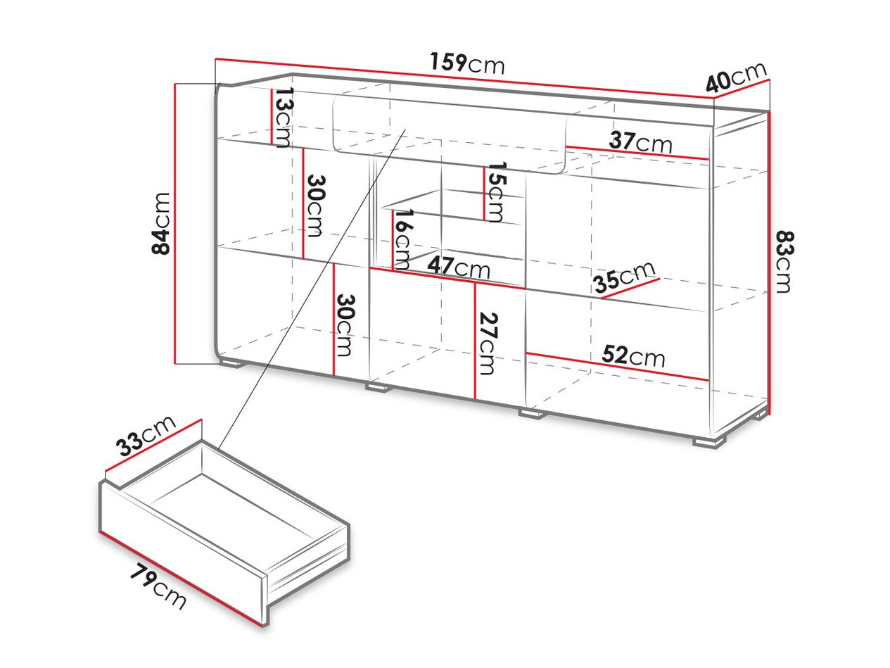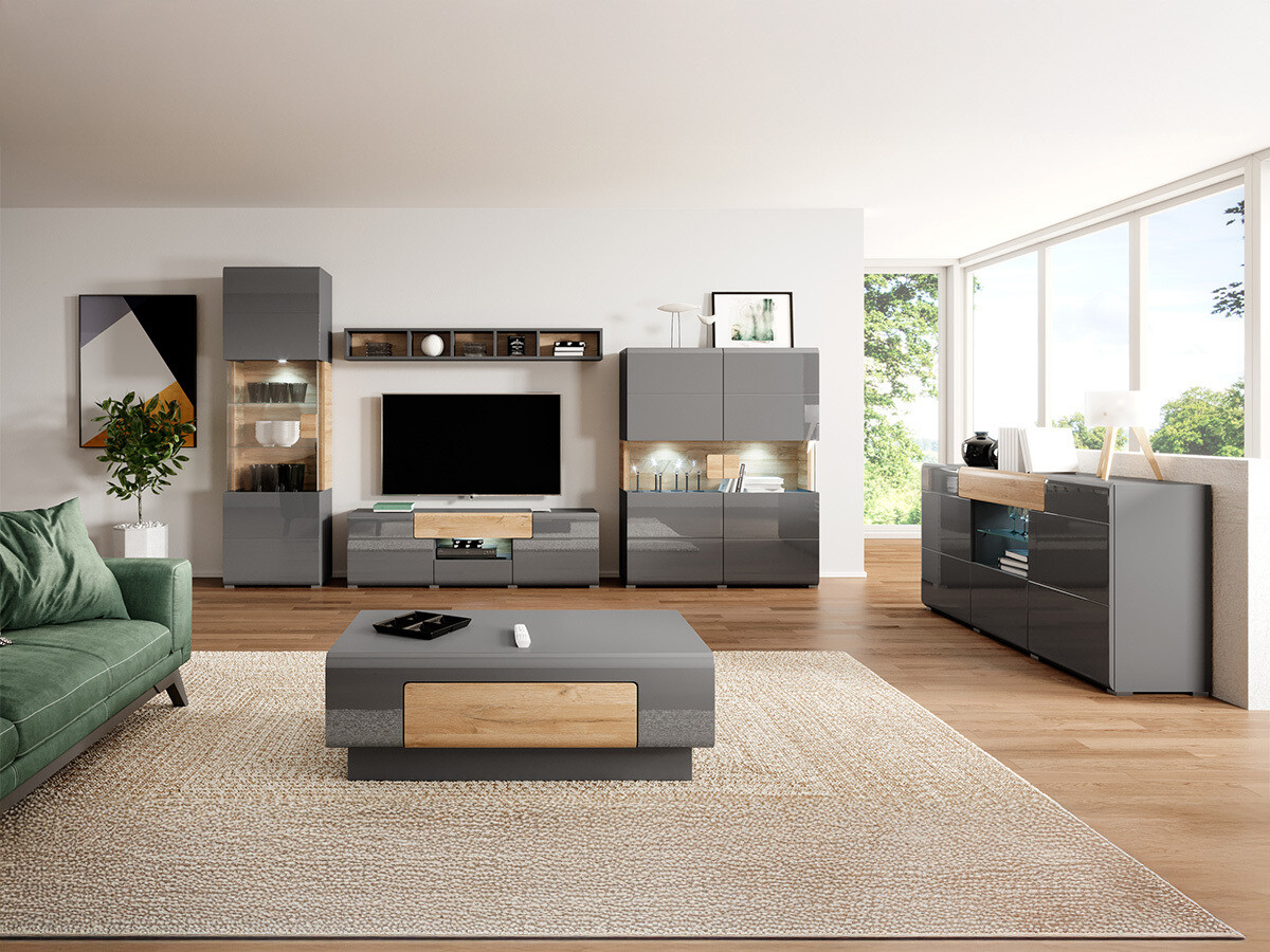 La collezione comprende armadi di varie dimensioni, ampie cassettiere, una mensola e un tavolino. La finitura lucida dei mobili ingrandirà la stanza a livello visivo. Le ante e i cassetti della cassettiera si aprono in un clic - comodità assicurata dal meccanismo "Push to open" integrato.