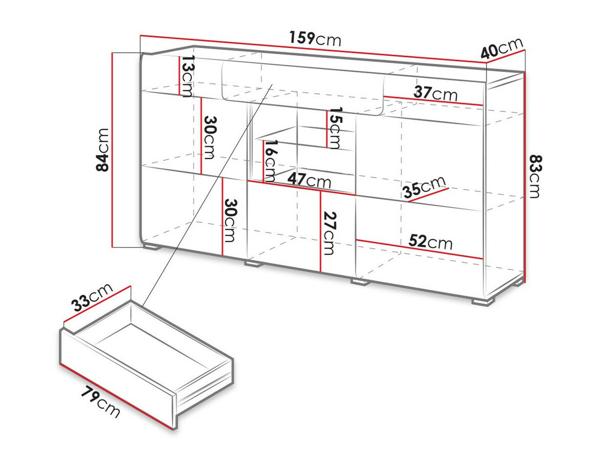 La collezione comprende armadi di varie dimensioni, ampie cassettiere, una mensola e un tavolino. La finitura lucida dei mobili ingrandirà la stanza a livello visivo. Le ante e i cassetti della cassettiera si aprono in un clic - comodità assicurata dal meccanismo "Push to open" integrato.