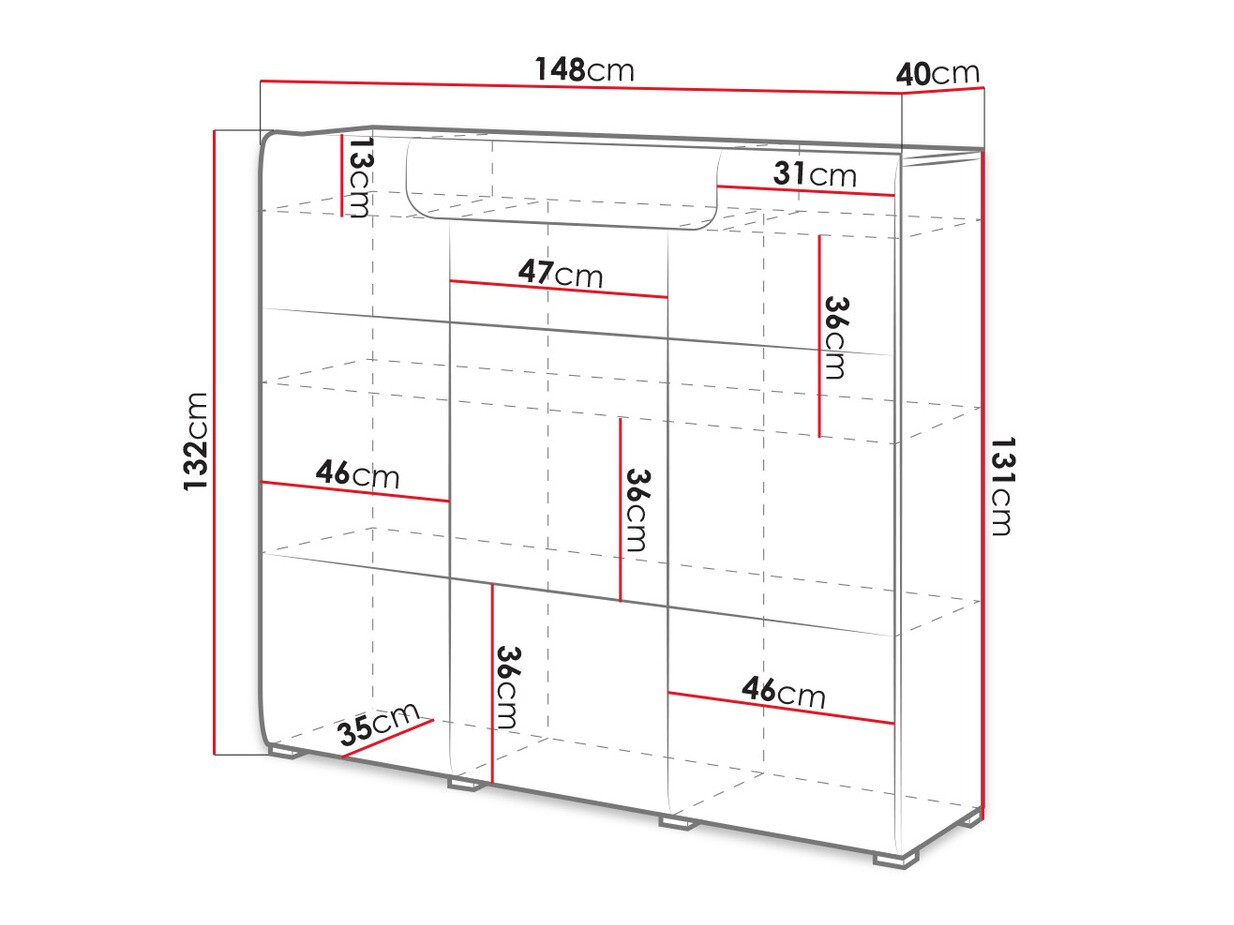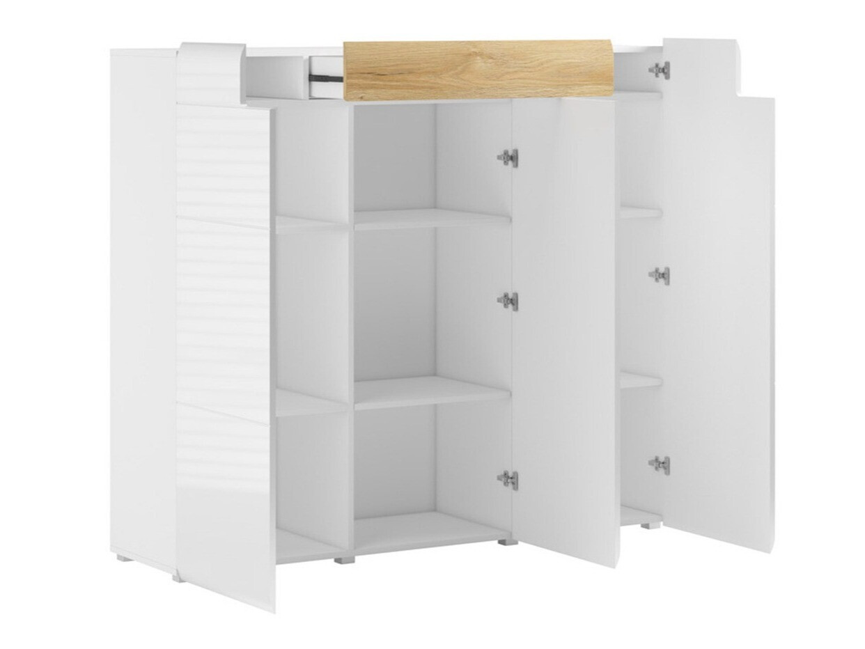 La collezione comprende armadi di varie dimensioni, ampie cassettiere, una mensola e un tavolino. La finitura lucida dei mobili ingrandirà la stanza a livello visivo. Le ante e i cassetti della cassettiera si aprono in un clic - comodità assicurata dal meccanismo "Push to open" integrato.
