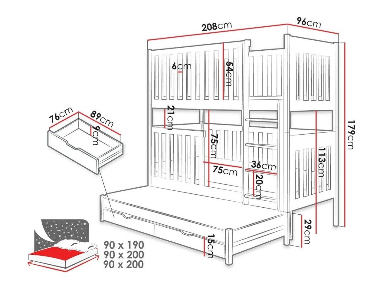 Siamo molto contenti del letto e i bambini sono felicissimi. I paraurti sono esattamente come volevamo: distanza alta e corta tra le griglie. La scala è di nuovo come la volevamo - la distanza tra i gradini è perfetta per essere utilizzata dai bambini (i nostri hanno 4,7 e 1,9 anni). E anche se è un letto a castello che ha anche un terzo letto, come un cassetto, i 2 cassetti incorporati che stanno sotto il 3° letto sono spaziosi - non ce lo aspettavamo, onestamente. Grazie per il prodotto e la serietà.