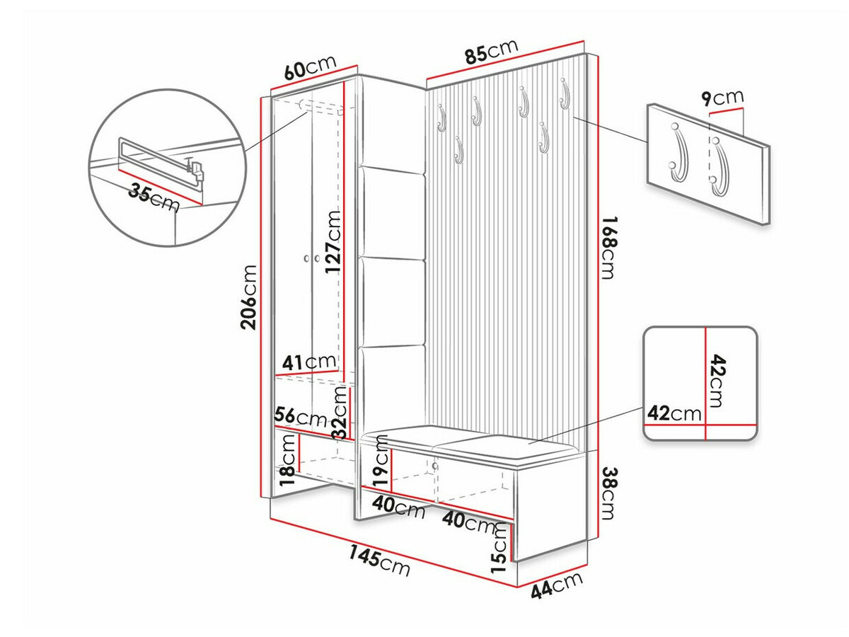 Il set è carino, ma le cerniere delle ante dei mobili potrebbero essere retrattili, ora sono semplici; non c'erano colla o strisce di montaggio per attaccare i cuscini, non c'erano elementi di fissaggio per fissare la parete alla parete. Almeno un paio di opzioni possibili si sarebbero potute aggiungere in modo da non doverle cercare da soli. Le staffe per i ripiani dei mobili potrebbero essere nascoste, ora sono l'opzione più economica. Tutto il resto è fantastico, bello esteticamente, facile da usare.