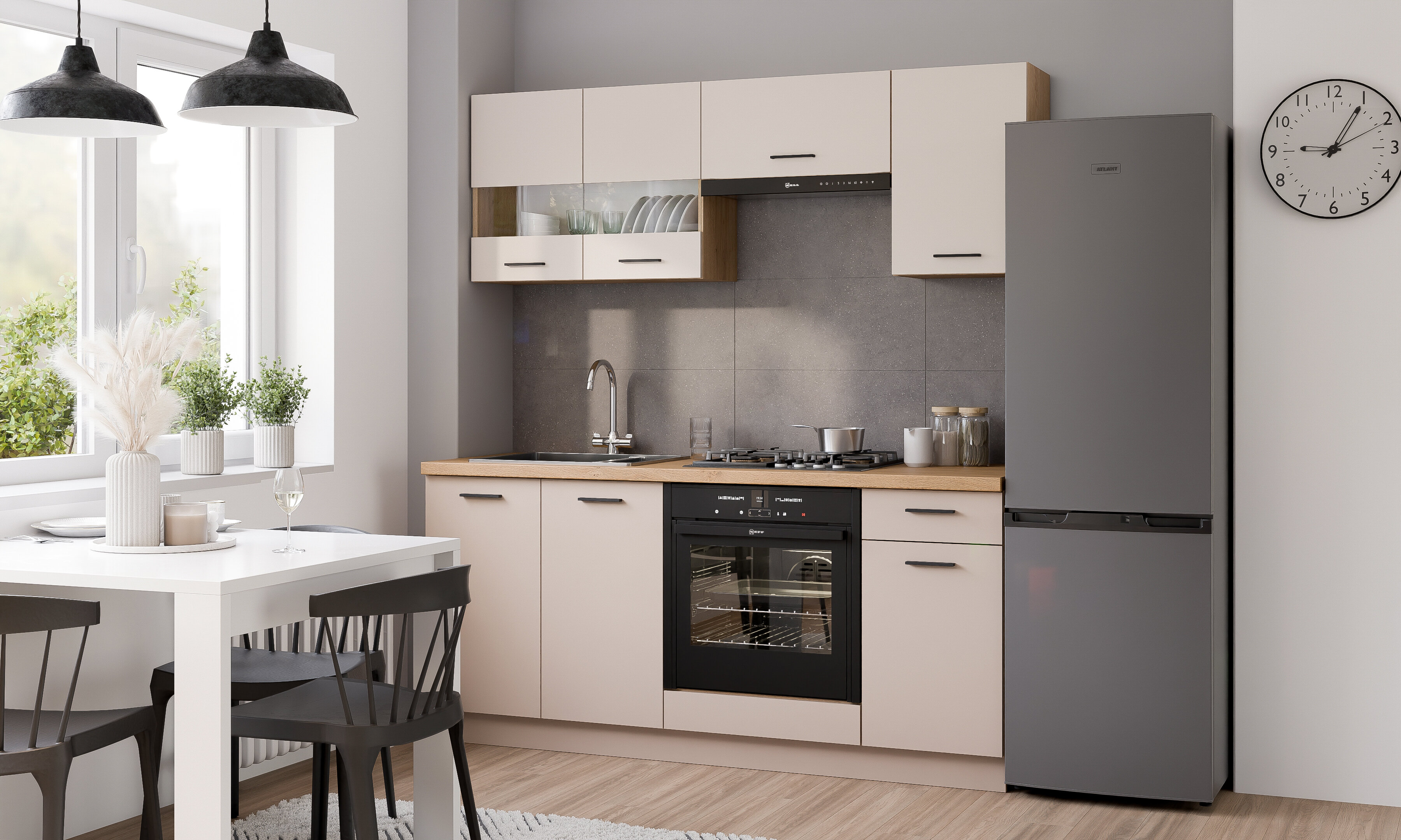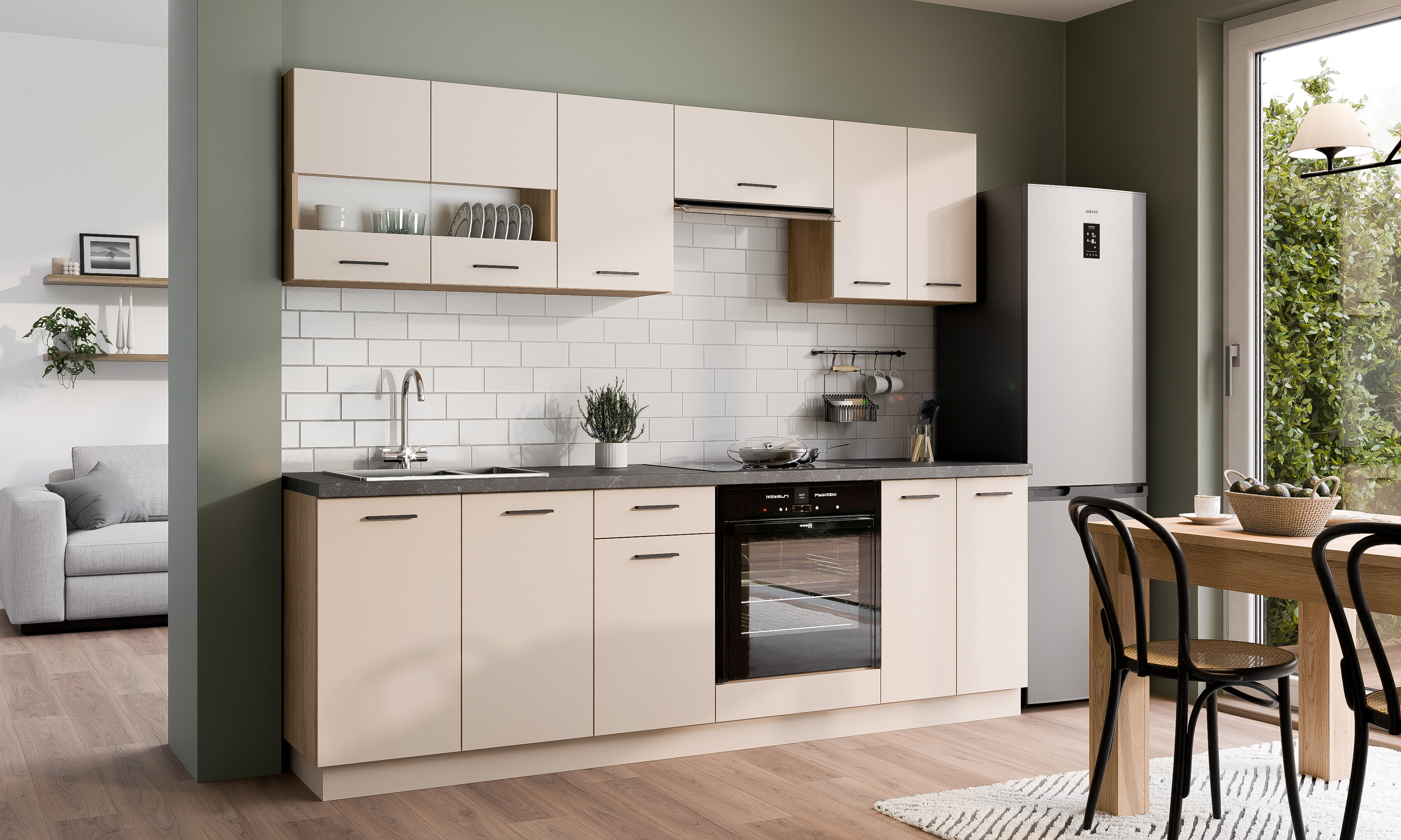 Crea un set da cucina unico con la collezione di mobili da cucina modulari. Questa collezione include una varietà di mobili a pavimento e a parete, e puoi anche scegliere tra diversi set da cucina preassemblati. Le maniglie in plastica nera si abbinano perfettamente al design minimalista dei mobili. I piedini regolabili consentono di adattare i mobili a pavimenti irregolari e ne garantiscono la stabilità. Tutti i mobili sono dotati di un meccanismo di chiusura ammortizzata che protegge ante e cassetti da una chiusura rapida.